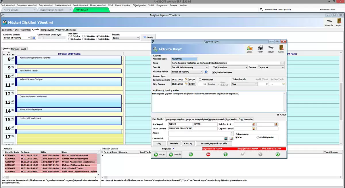 Müşterilerinize çeşitli aktivite kayıtları kaydederek ajanda panelinde listeleyebilir, alarmlar kurarak hatırlatıcı ile hiç bir aktivitenizi kaçırmadan takip yapabilirsiniz.